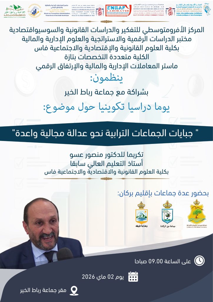 ينظم المركز الأفرو متوسطي للتفكير والدراسات القانونية والسوسيو اقتصادية، بتنسيق مع مختبر الدراسات الرقمية والاستراتيجية والعلوم الإدارية والمالية بكلية العلوم القانونية والاقتصادية والاجتماعية بفاس، والكلية متعددة التخصصات بتازة، وماستر المعاملات الإدارية والمالية والارتفاق الرقمي، وبشراكة مع جماعة رباط الخير، يوما دراسيا تكوينيا حول موضوع “جبايات الجماعات الترابية نحو عدالة مجالية واعدة”.