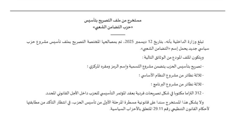تم الشروع بشكل رسمي في الإجراءات القانونية لتأسيس حزب سياسي جديد بالمغرب يحمل اسم “حزب التضامن الشعبي”، وذلك بعد نشر الإعلان المتعلق به في الجريدة الرسمية عدد فاتح يناير 2026.