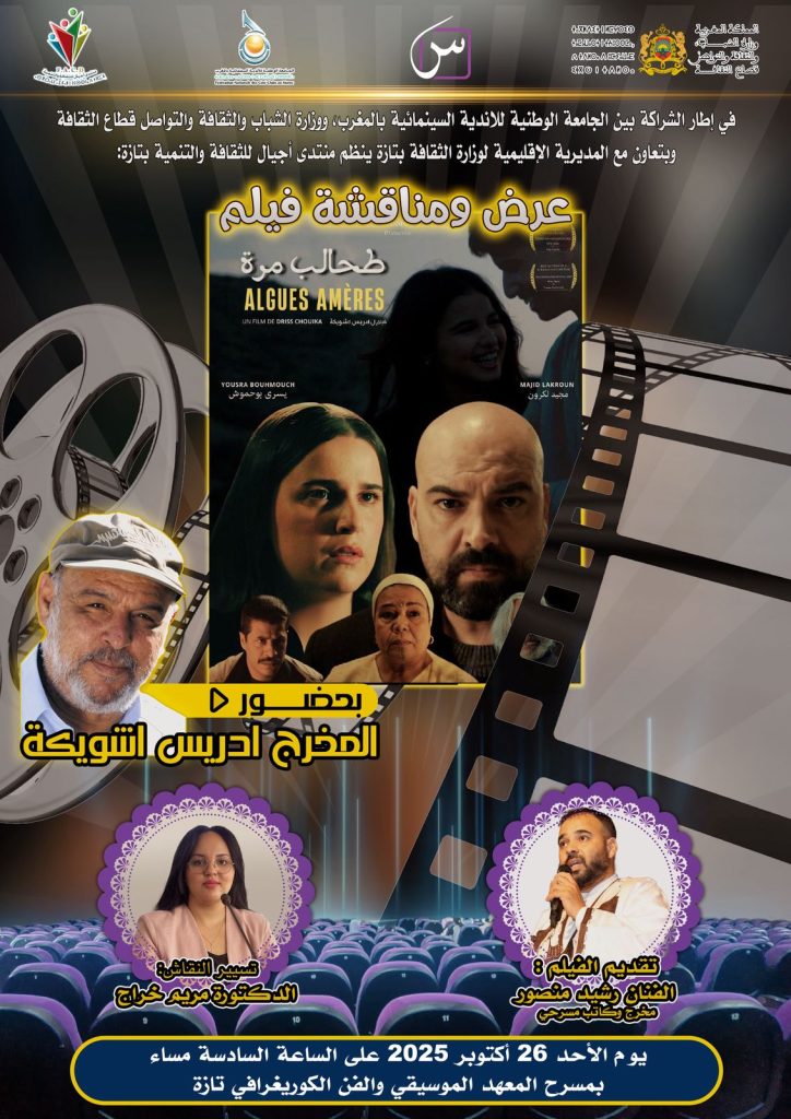ينظم منتدى أجيال للثقافة والتنمية بشراكة مع الجامعة الوطنية للأندية السينمائية بالمغرب وبدعم من وزارة الشباب والثقافة والتواصل، وبتعاون مع المديرية الإقليمية للثقافة بتازة، عرضًا ومناقشة للفيلم المغربي المتميز “طحالب مُرّة – ALGUES AMÈRES”، وذلك يوم الأحد 26 أكتوبر 2025، ابتداءً من الساعة السادسة مساءً، بـ مسرح المعهد الموسيقي والفن الكوريغرافي بتازة.