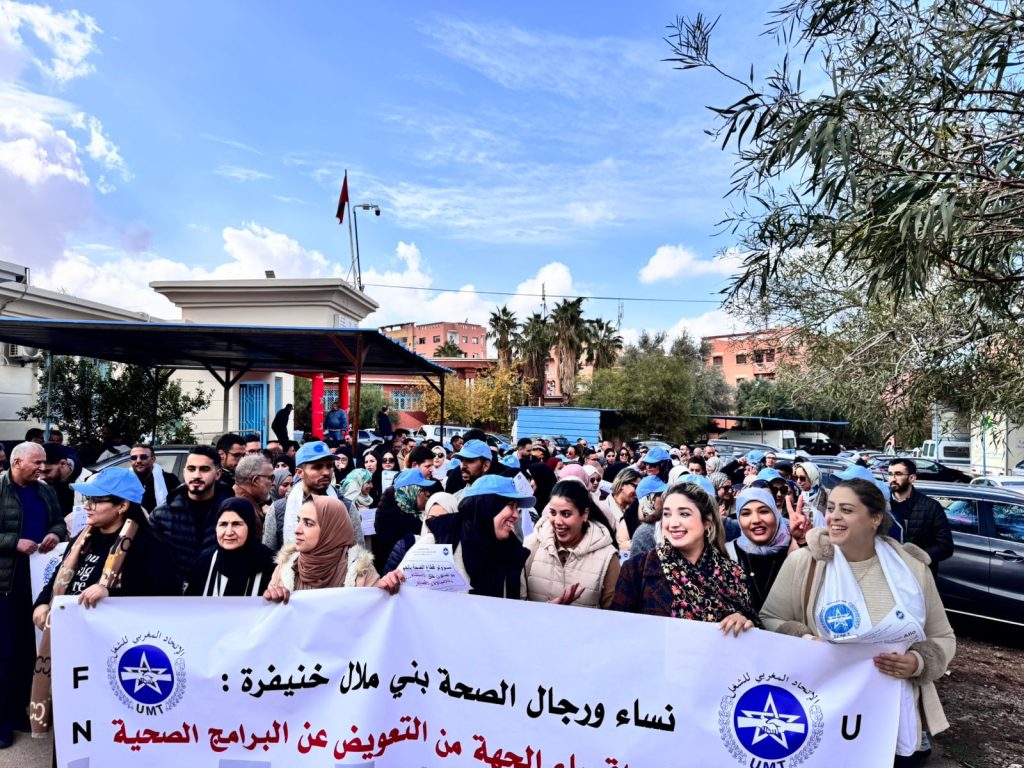 شهدت جهة بني ملال–خنيفرة يوم الأربعاء 3 دجنبر 2025 تنظيم وقفة احتجاجية جهوية واسعة بدعوة من المكتب الجهوي للجامعة الوطنية للصحة المنضوية تحت لواء الاتحاد المغربي للشغل، للمطالبة بالإفراج عن تعويضات البرامج الصحية التي لم يتوصل بها مهنيّو الصحة بالجهة أسوة بباقي الجهات. وانطلقت الوقفة أمام المديرية الجهوية للصحة ببني ملال قبل أن تمتد إلى جنبات المستشفى الجهوي، حيث عبّر المشاركون من مختلف أقاليم الجهة عن رفضهم لما اعتبروه تمييزاً وإقصاءً غير مبرّر.